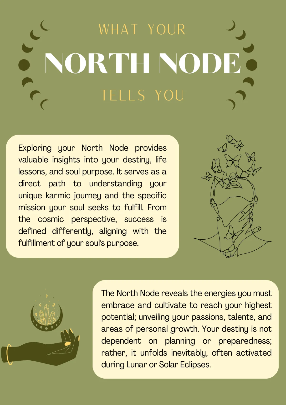 Your North Node represents the path of growth and fulfillment in this lifetime, indicating the lessons you're here to learn and the direction in which your soul longs to evolve. By exploring the sign and house placement of your North Node, you'll gain invaluable insights into the unique gifts and challenges that shape your path.