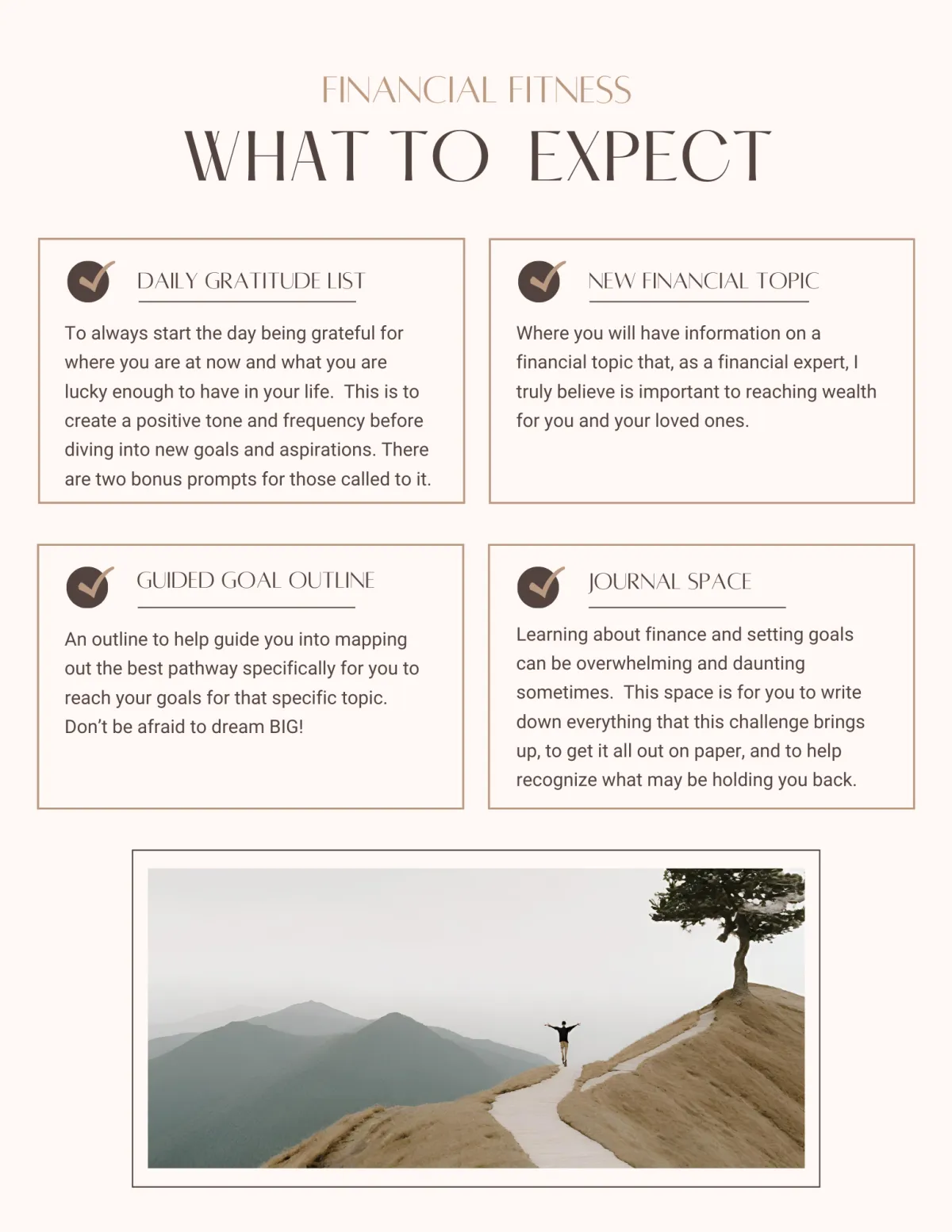 Are you ready to take control of your financial future and create the life of your dreams? Download this Financial Fitness Challenge PDF, a 10-day program designed to help you cultivate better financial habits and achieve financial wellness.